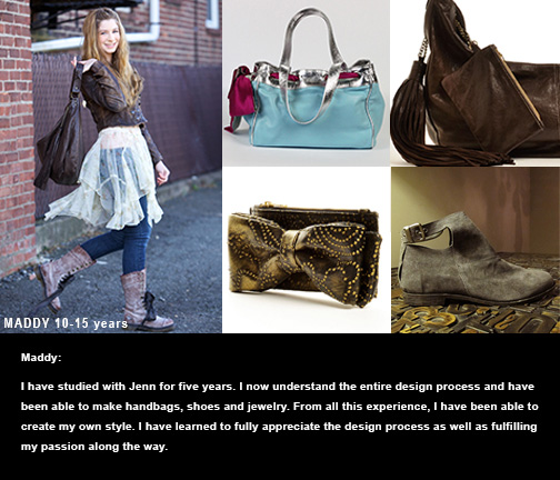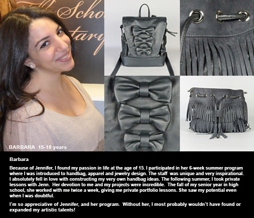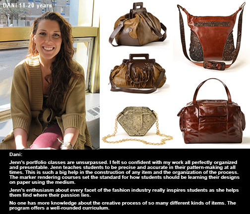 Jenn is my mentor and friend. I started with her at the age of 13 and I am still in touch with her ten years later. Thanks to Jenn, I was the best student in my freshman Fashion Design program at Drexel. Her teaching style produced an end product that amazed everyone. Jenn was responsible for getting me an internship as a handbag patternmaker even before attending college. This led, during college, to another internship/job. Thank you, Jenn, for all your help.