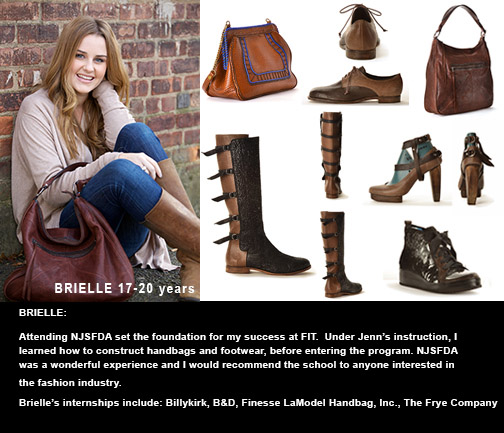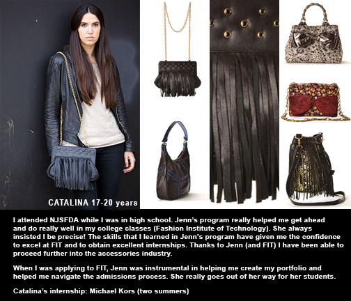 Through my education at NJSFDA, I was able to build a strong foundation for the accessories industry. With this background, I was able to intern after my first year of college (FIT) at Manolucci Designs where I now work full-time. The overall experience was also beneficial throughout my other internships at Mark Jacobs International, Badgley Mischka and The Frye Company. I am grateful to have attended Jenn’s school and learn hands-on what it takes to create the finished products I now work with everyday.